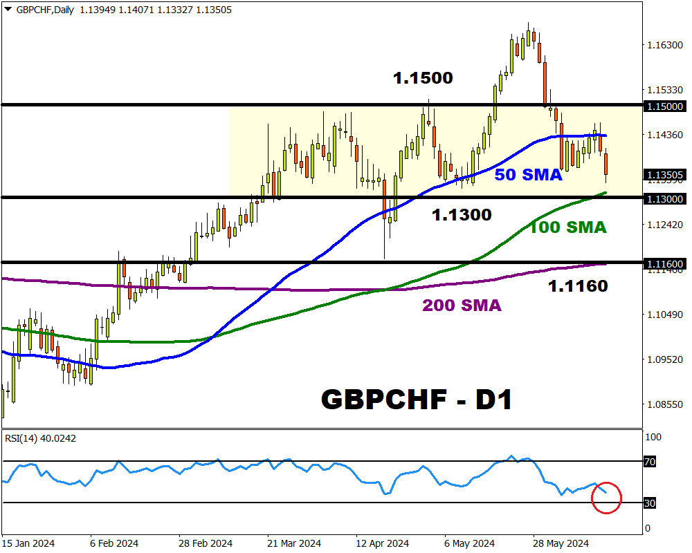 The GBPCHF is under pressure on the daily charts with prices approaching the 100-day SMA. However, the Relative Strength Index is heading towards 30 – signalling that prices may be nearing oversold conditions.