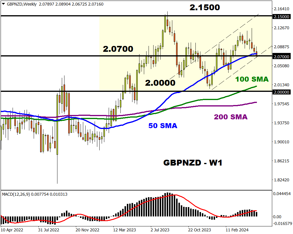 Our attention falls on the GBPNZD which has been trapped within a 1500-pip monthly range since August 2023.