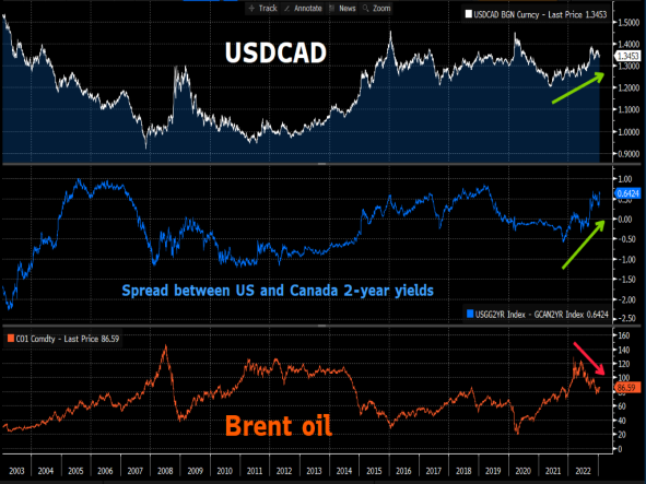 (Rising US vs. Canada spreads = weaker CAD = rising USDCAD; and vice versa)
