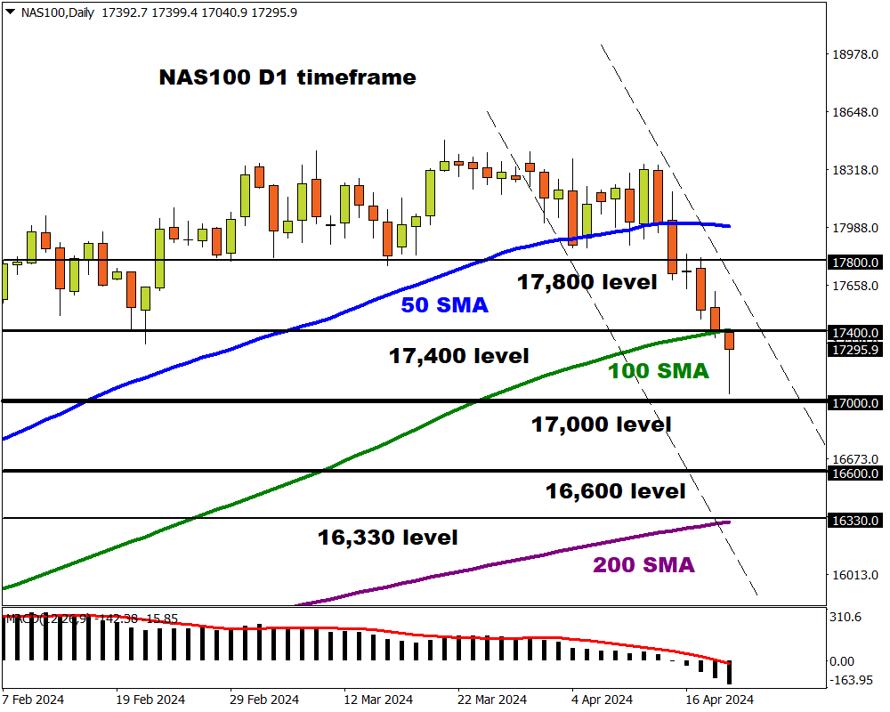NAS100 is under pressure on the daily charts with the index respecting a bearish channel. Prices are trading below the 50, 100 and 200-day SMA while the MACD trades below zero.