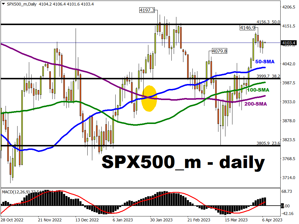 - 4156.3: 50% Fibonacci retracement from 2022’s plummet (between record high in January 2022 and October’s trough).