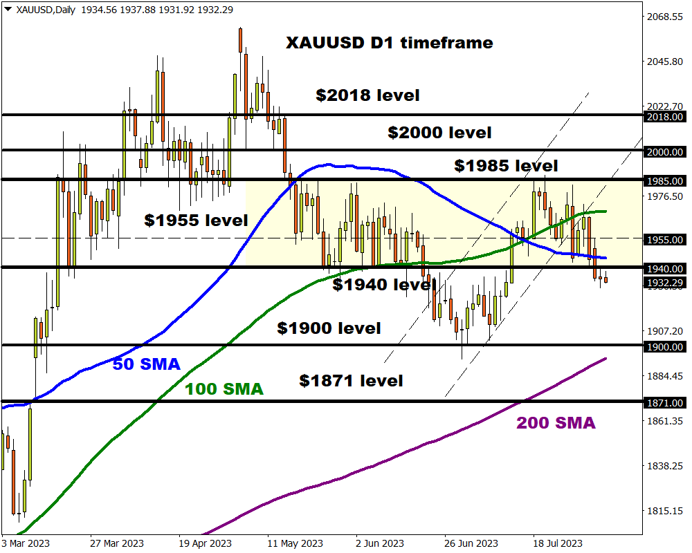 Gold prices are under pressure on the daily charts with prices trading below the 50 and 100, day SMA. The recent breakdown below the $1940 support could signal further downside towards $1900 and $1871, respectively. Should prices push back above $1955, this could open a path towards $1985 and $2000.