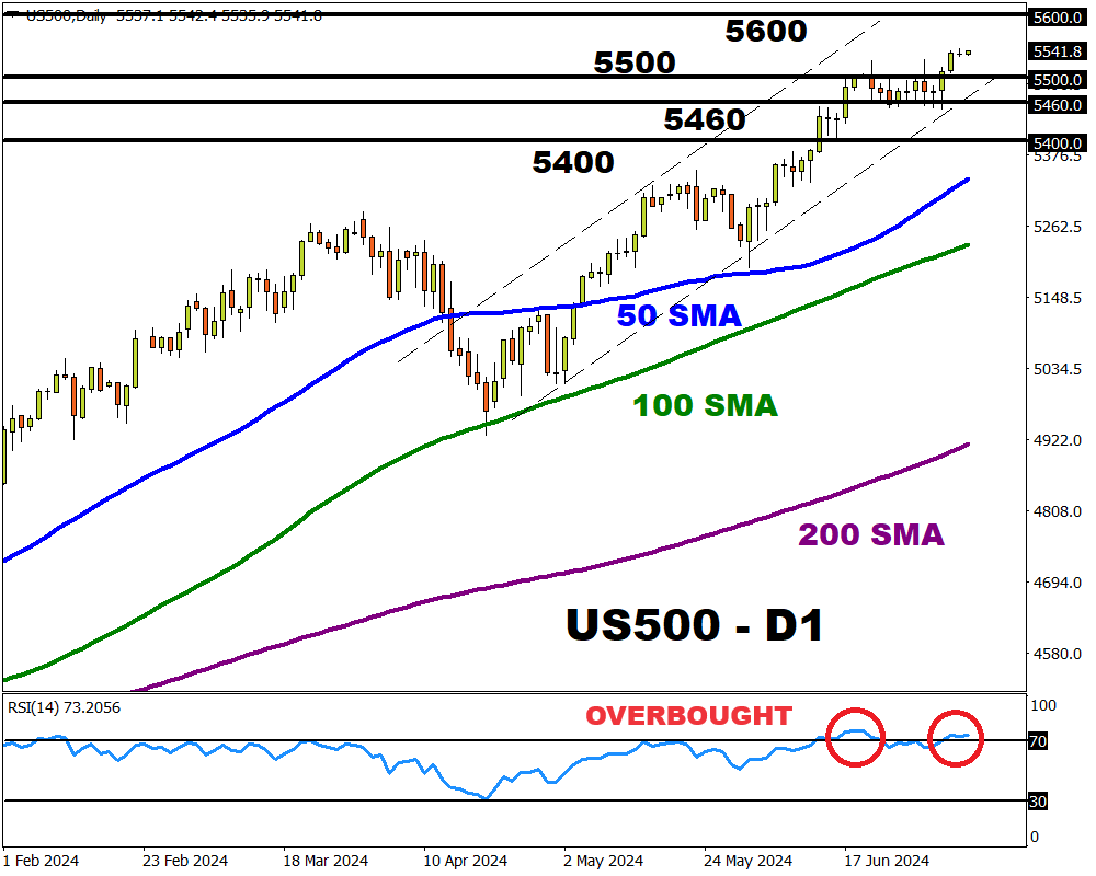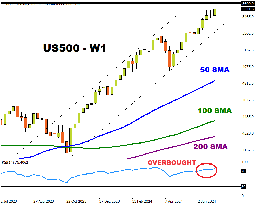 The US500 is firmly bullish on the weekly and daily timeframe. However, the Relative Strength Index (RSI) is above 70 – indicating that prices are heavily overbought.