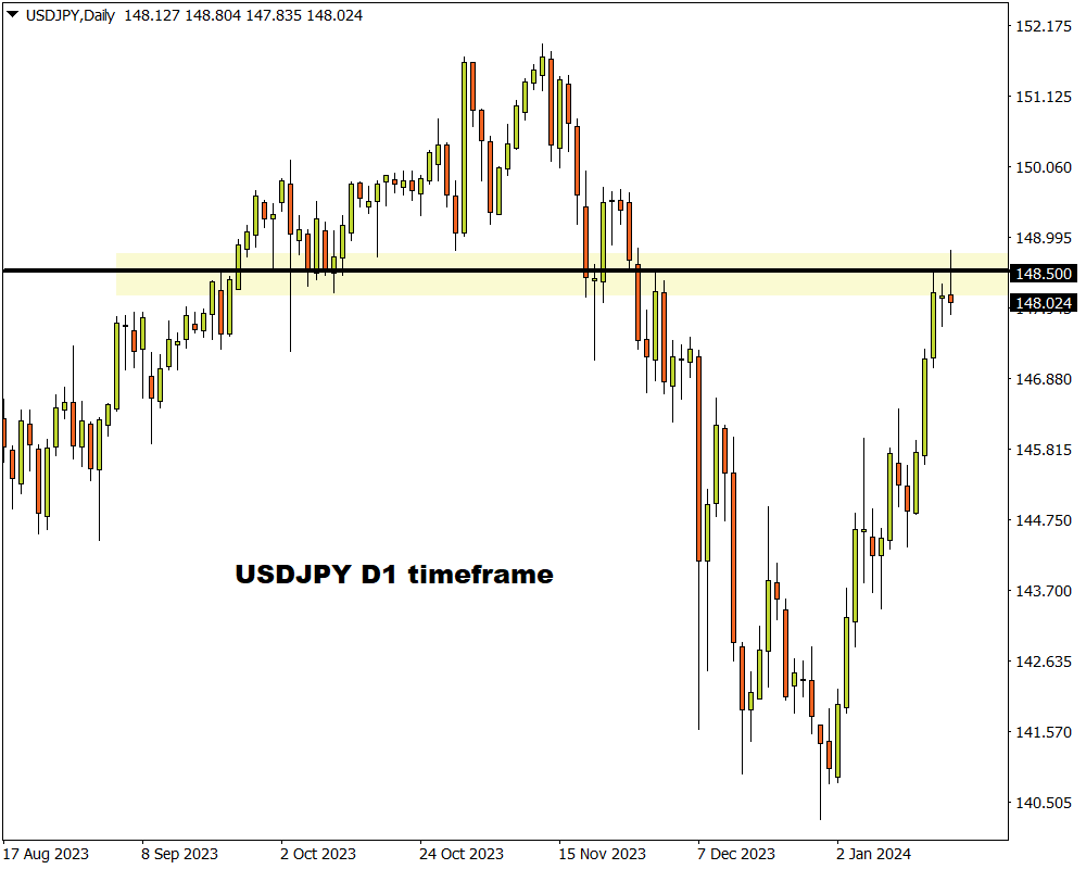 The widening interest rate differentials between the US and Japan over the recent weeks has propelled the USDJPY. Prices are testing resistance around 148.50 as of writing.