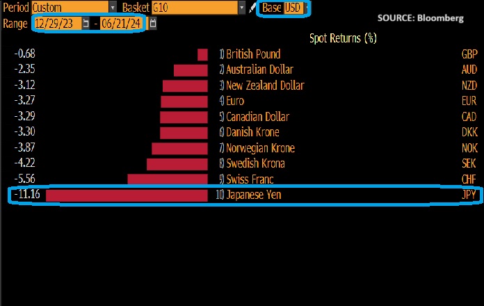 Already the Yen is set to wrap up the first half of 2024 with the title of worst-performing G10 currency against the US dollar, by a mile.