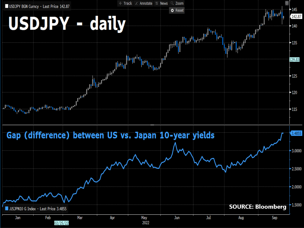 ... no surprise that investors have been flocking to the US dollar and less so the Japanese Yen, considering this massive gap between US and Japanese yields.