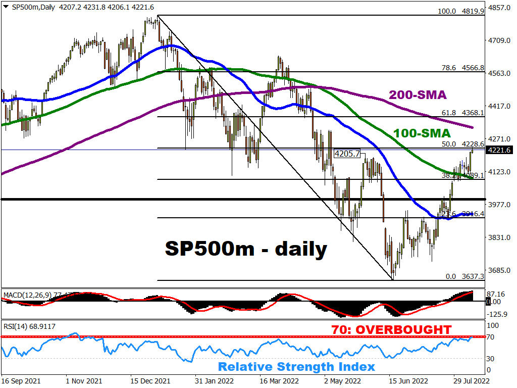 Looking back at the chart above, the S&P 500 has already managed to breach the 4228.6 line, which marks the halfway point from its peak-to-trough plummet in the first half of this year.