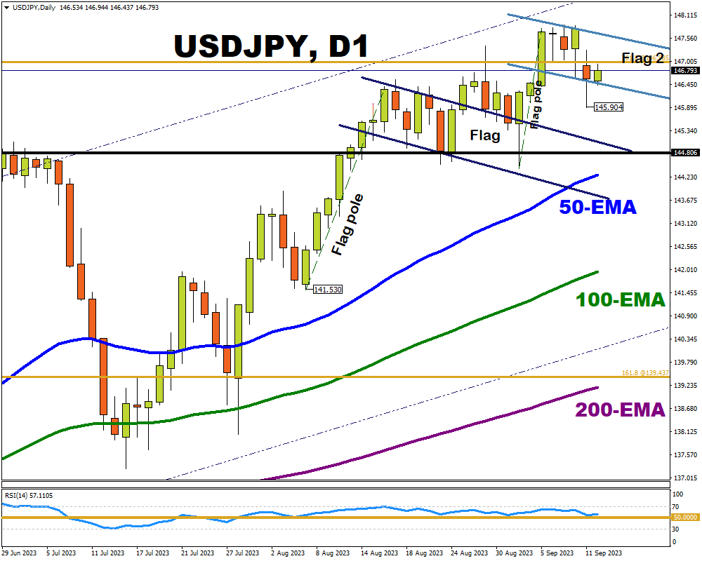 USDJPY bears on the other hand will be looking for a strong close below the current bullish flag’s support, and also below the psychologically-important 146.00 line.
